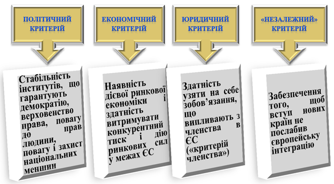У червні 1993 року Європейська рада в Копенгагені затвердила критерії для кандидатів на вступ до Європейського Союзу (Копенгагенські стандарти), зокрема: