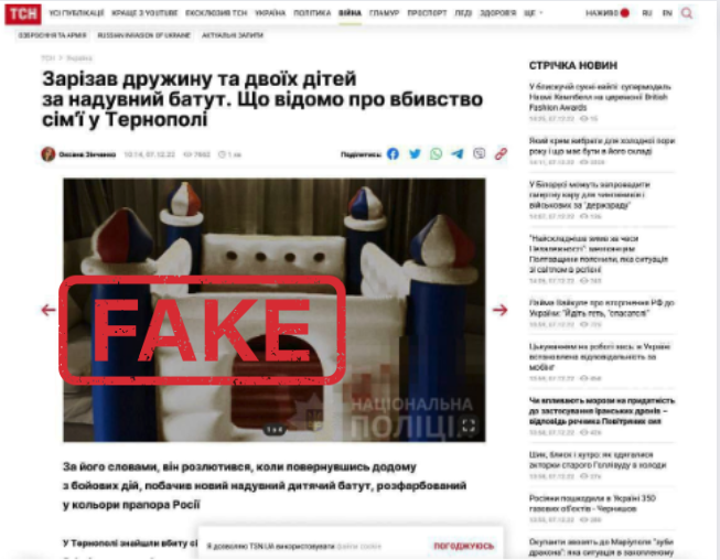 Подібне повідомлення розлетілось проросійськими телеграм-каналами. У ньому розповідається, що ніби солдат ЗСУ з Тернопільщини вбив свою дружину та двох дітей, коли замітив вдома дитячий батут у формі замку, що був розфарбований в кольорах російського прапору. Анонімні телеграм-канали до цього прикріплюють скриншот з новиною, яка нібито є матеріалом «ТСН» від 7 грудня 2022 року.
