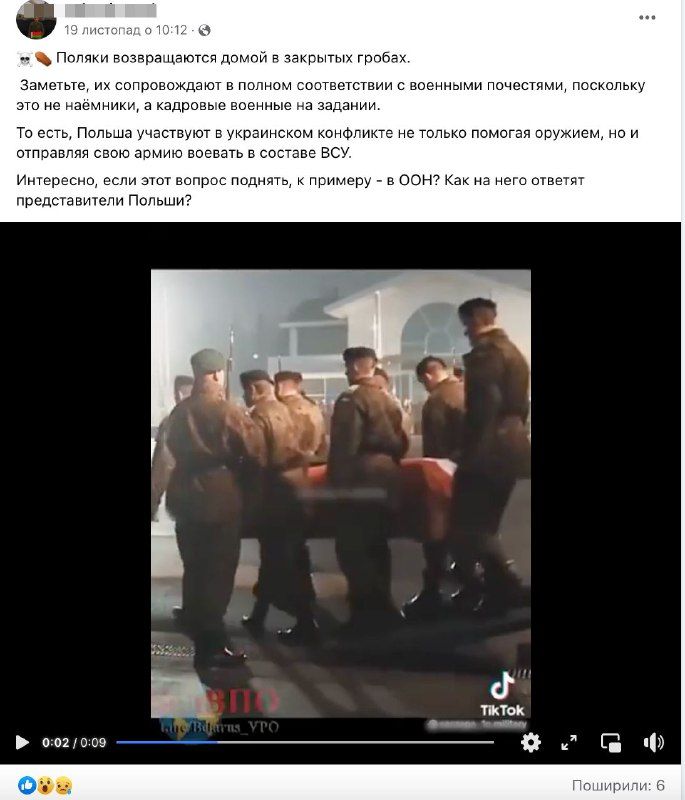 У різних соцмережах почали поширювати відео, на якому видно, як військові виносять труну ймовірніше всього свого земляка. У дописах під відео стверджується, що це зустріч саме польських військових. Також наголошується, що померлим військовим віддаються почесті, маючи на увазі, що це кадрові військові, а не добровольці. Вважається, ніби військові загинули в Україні.