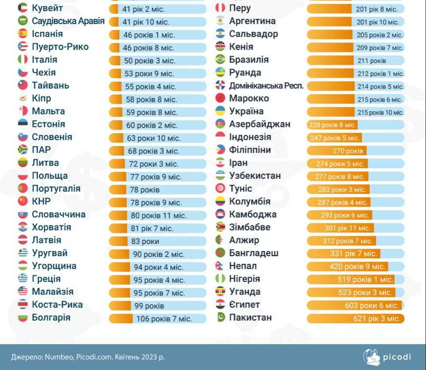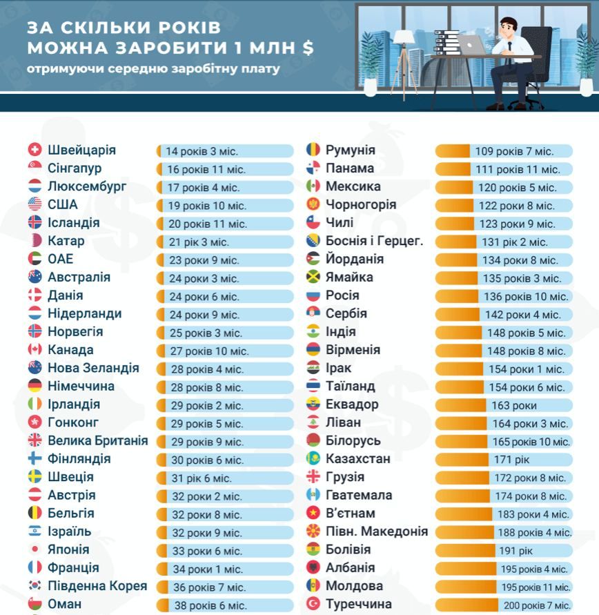 Україна займає 86-у позицію у рейтингу. Отримуючи середньостатистичну заробітну плату по країні, заробити мільйон доларів можна за 215 років і 10 місяців.