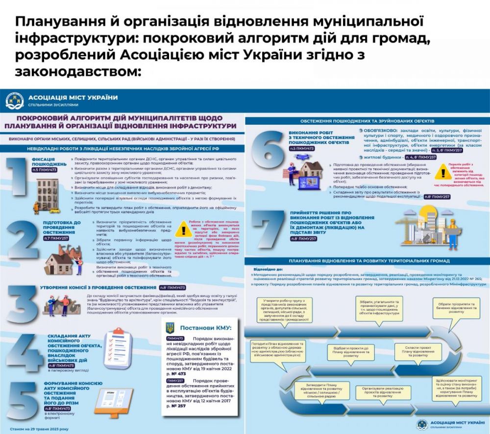 Асоціація міст України розробила покроковий алгоритм дій муніципалітетів щодо планування й організації відновлення муніципальної інфраструктури. З ним можна ознайомитися у інфографіці наведеній нижче, а також за посиланням - ТУТ