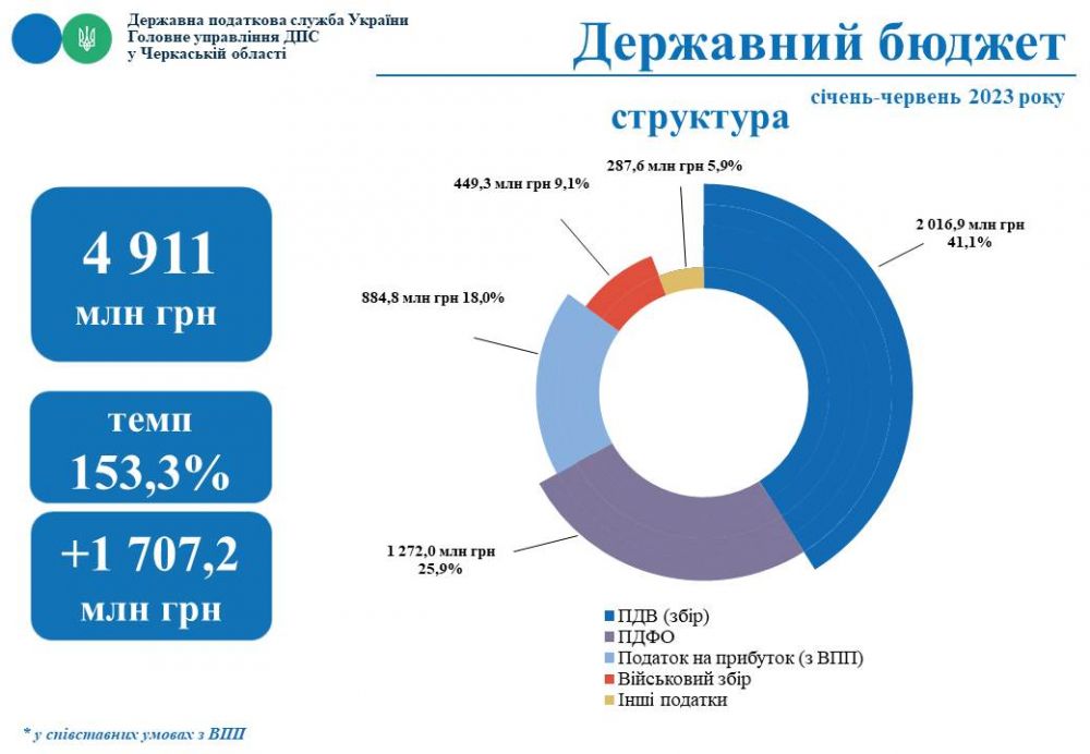 Як повідомив в.о. начальника Головного управління ДПС у Черкаській області Сергій Гришко за cічень-червень 2023 року платниками податків Черкаської області до бюджетів усіх рівнів сплачено 11,7 млрд грн податків, зборів та платежів. У порівнянні з аналогічним періодом 2022 року до бюджетів спрямовано на 43,5 відс., або на 3,5 млрд грн податків більше.
