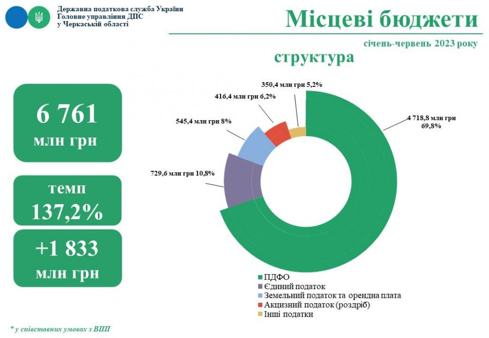 Місцеві бюджети Черкаської області отримали 6,8 млрд грн, що на 37,2 відс. або на 1,8 млрд грн більше, ніж за січень-червень 2022 року.