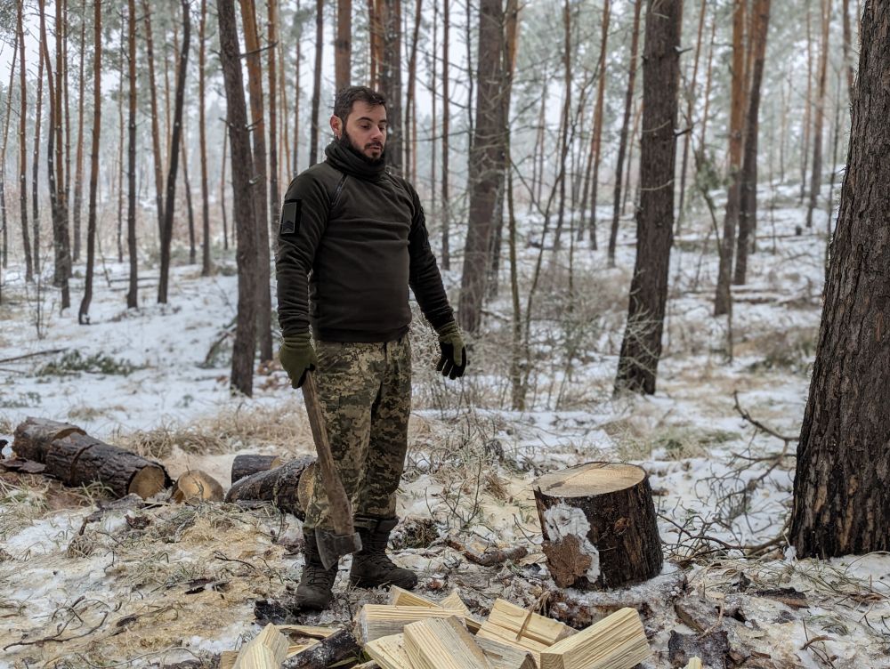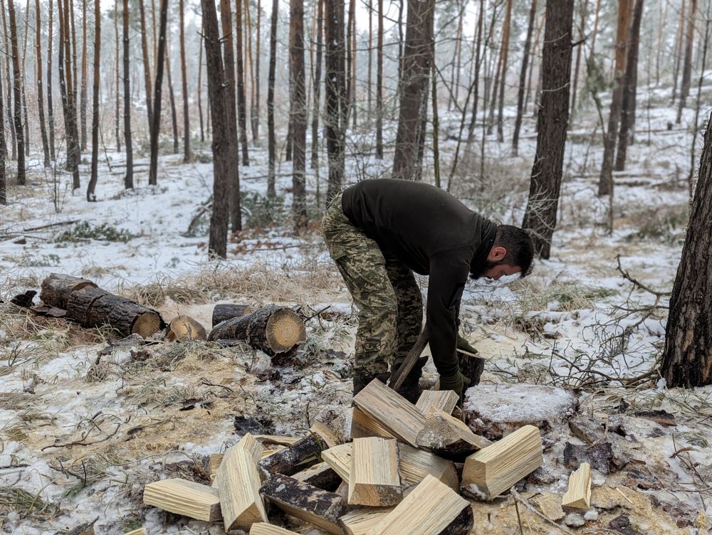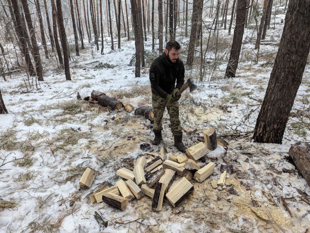 Війна в умовах суворої війни є важкою і дошкульною. Артилерист Ігор рубає дрова для обігріву бліндажа. Він облаштував надійне укриття разом з побратимами.