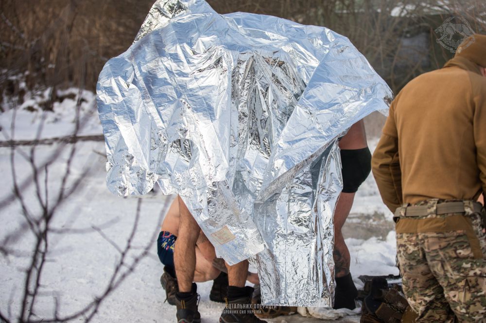 Наступний крок - не допустити аби у людини, яка щойно побувала у крижаній воді не сталося переохолодження. Тут воїни використовують спосіб зігрівання термоковдрою в колі.
